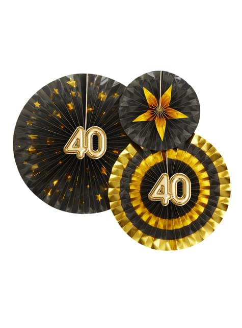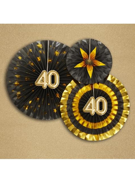 3 sekalaista, koristeellista "40" viuhkaa - Glitz & Glamour Black & Gold